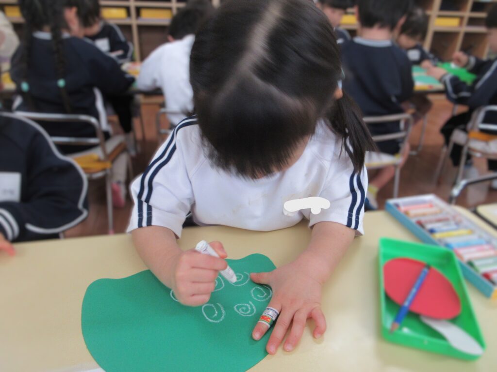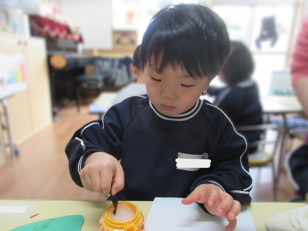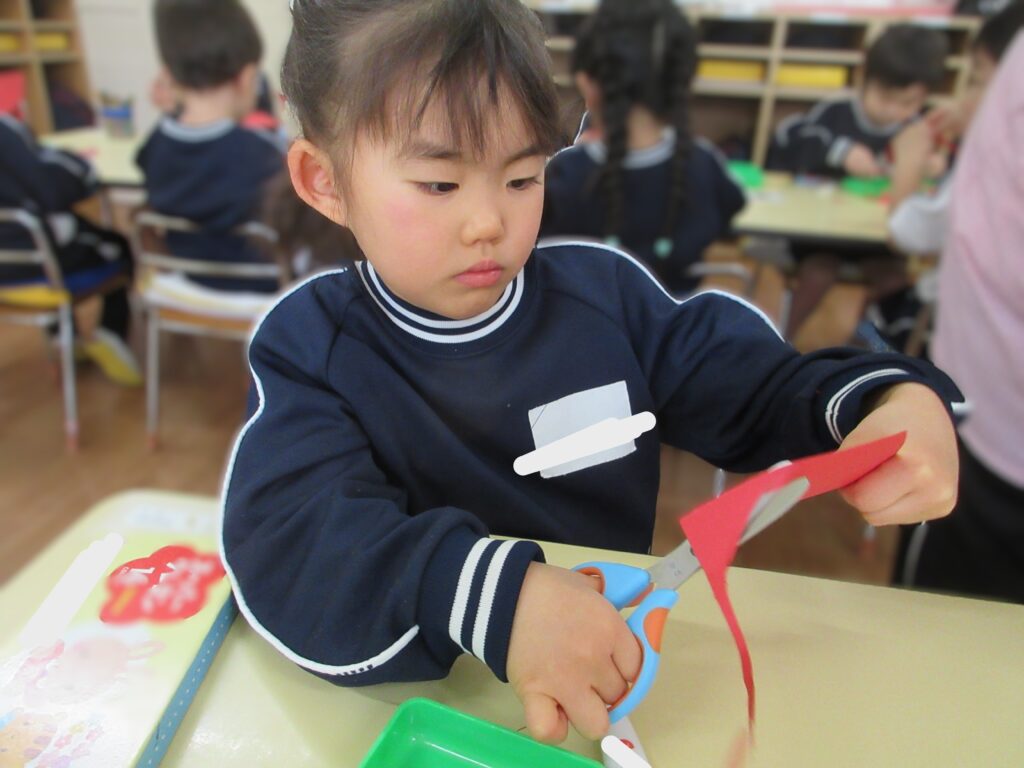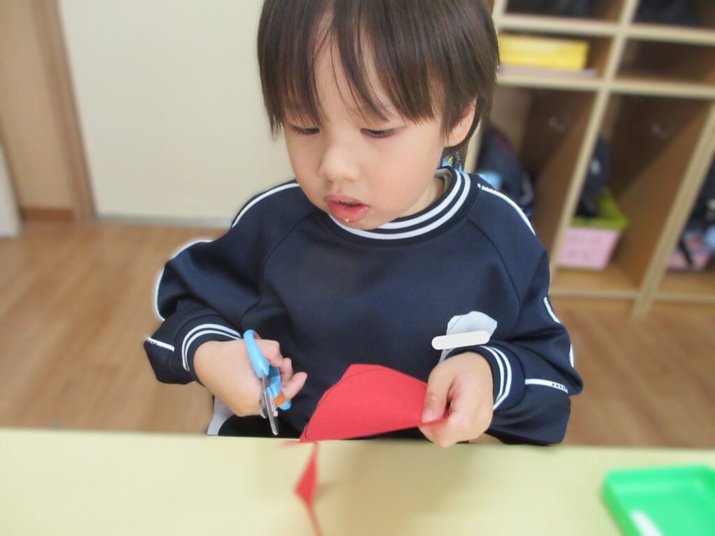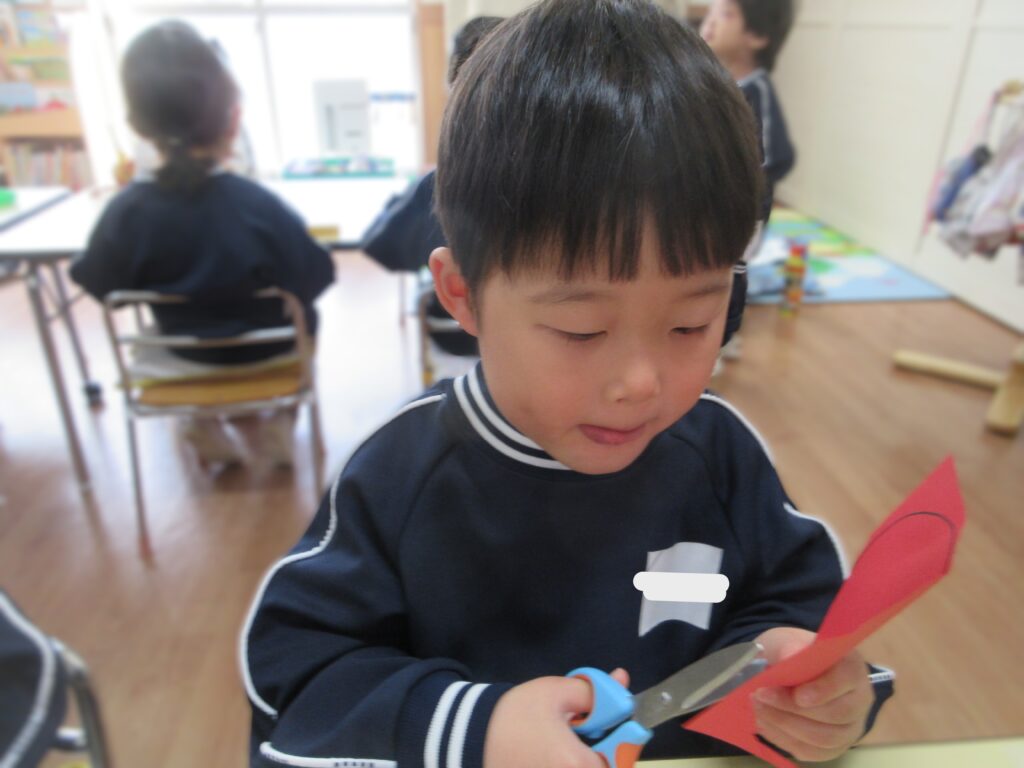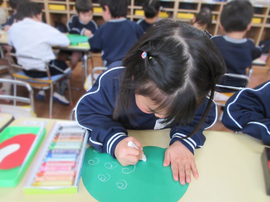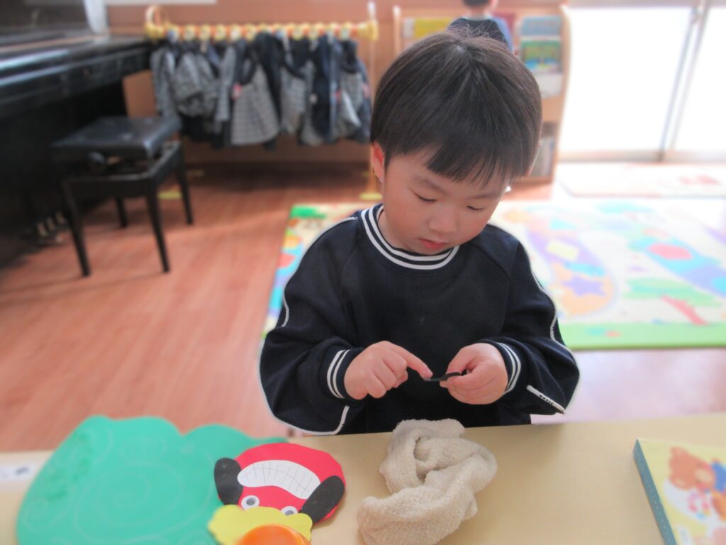 遅くなりましたが、新年あけましておめでとうございます。 つくし組ではお正月にちなんで獅子舞製作を行いました。 今回は初めて丸の形に切ることにチャレンジしました♪ 慎重に手を切らないようにゆっくりと行っていました😊 とっても上手に切ることができましたね♡ 白いぐるぐるの渦巻き線も上手に描けるようになりました! 細かいパーツものりの量を調節して貼ることが出来ました。