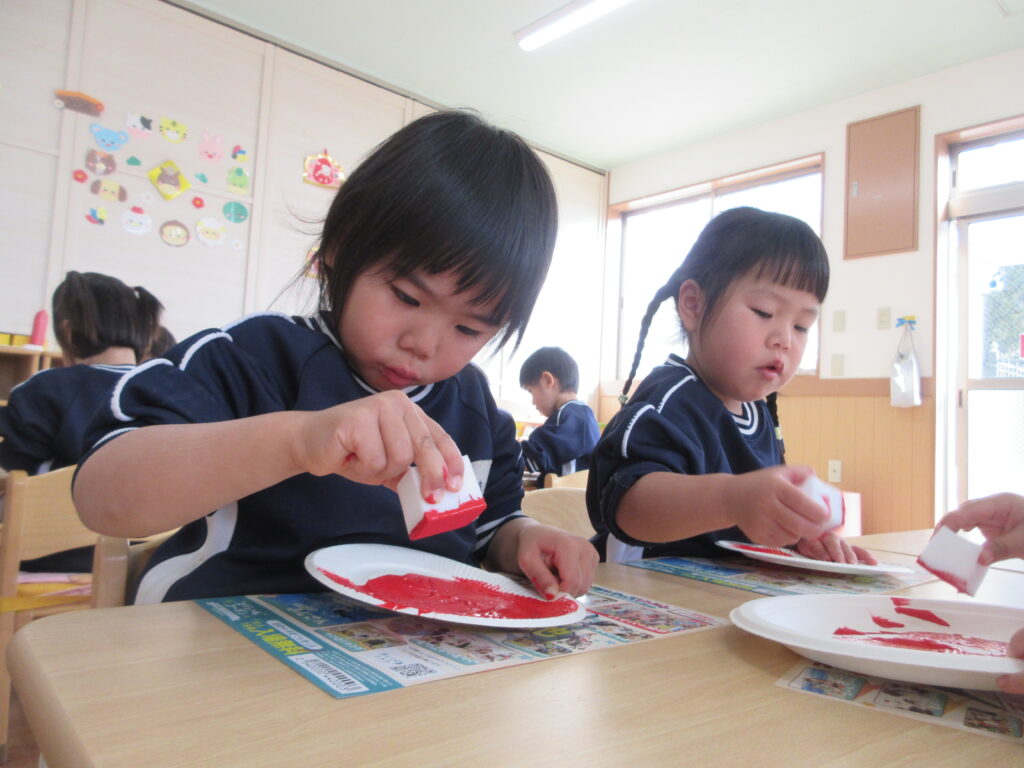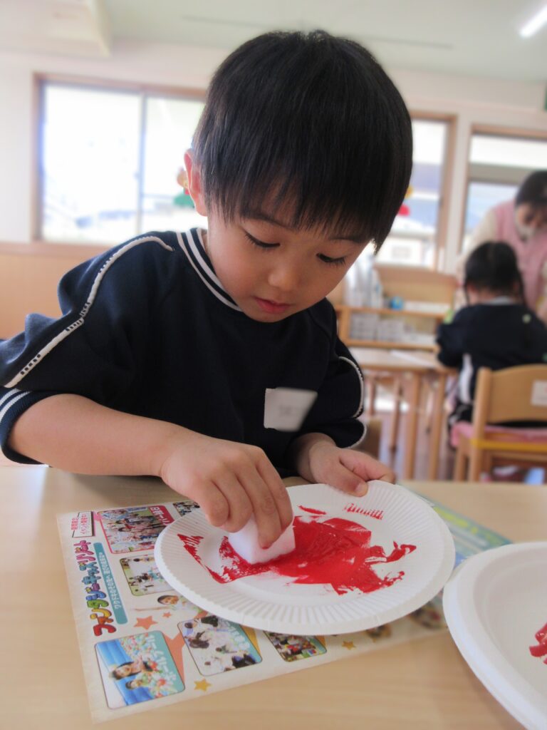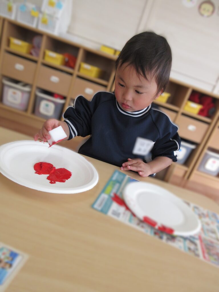 スポンジに絵の具を付けて、ぽんぽんっ!